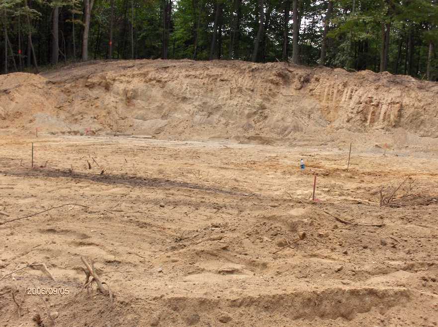Here is a shot of the hill in the back - the front has been mowed down for the basement. Notice a stake painted with red color -- ya it is the beginning ... Picture 1