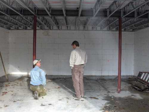 Dave Dotson using the Floor at the Basement Level as a drafting board discussing, with Robert Patterson of Wexford Homes, the use of Simpson Strong Tie to fasten the rim joist to the ICF wall.